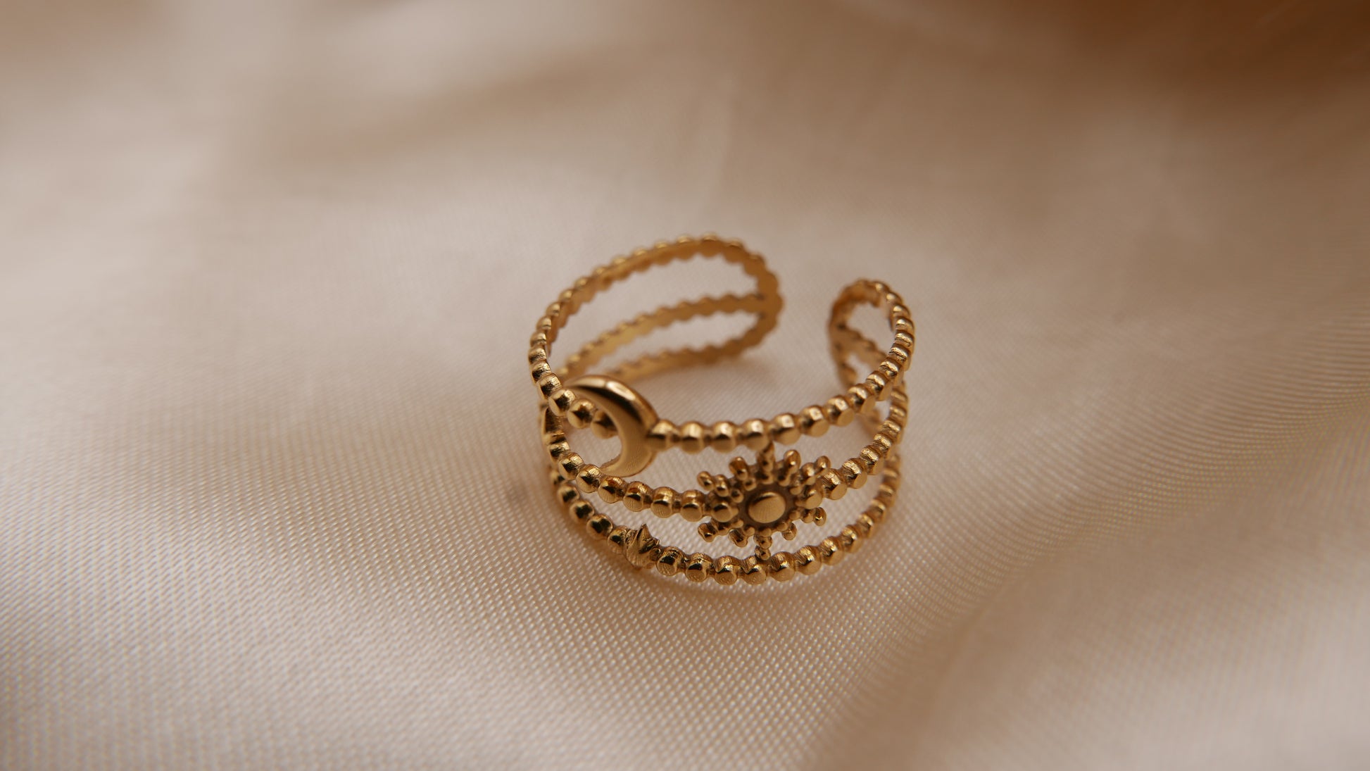 With a delicate moon and star charm, this ring adds a touch of celestial flair to any outfit. Plus, with its easy size adjustment, it's the ideal fit for any finger.